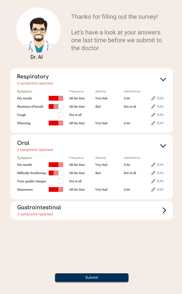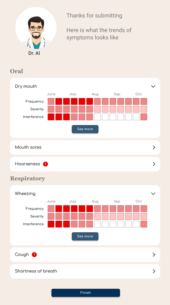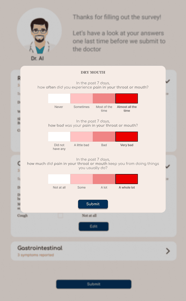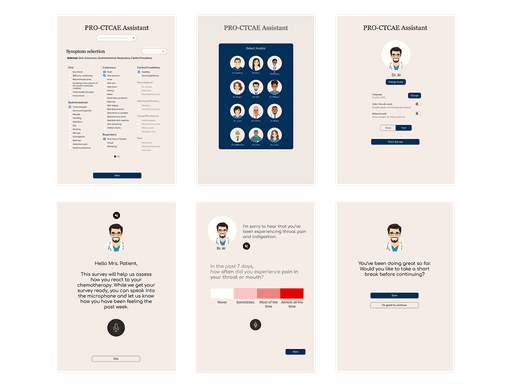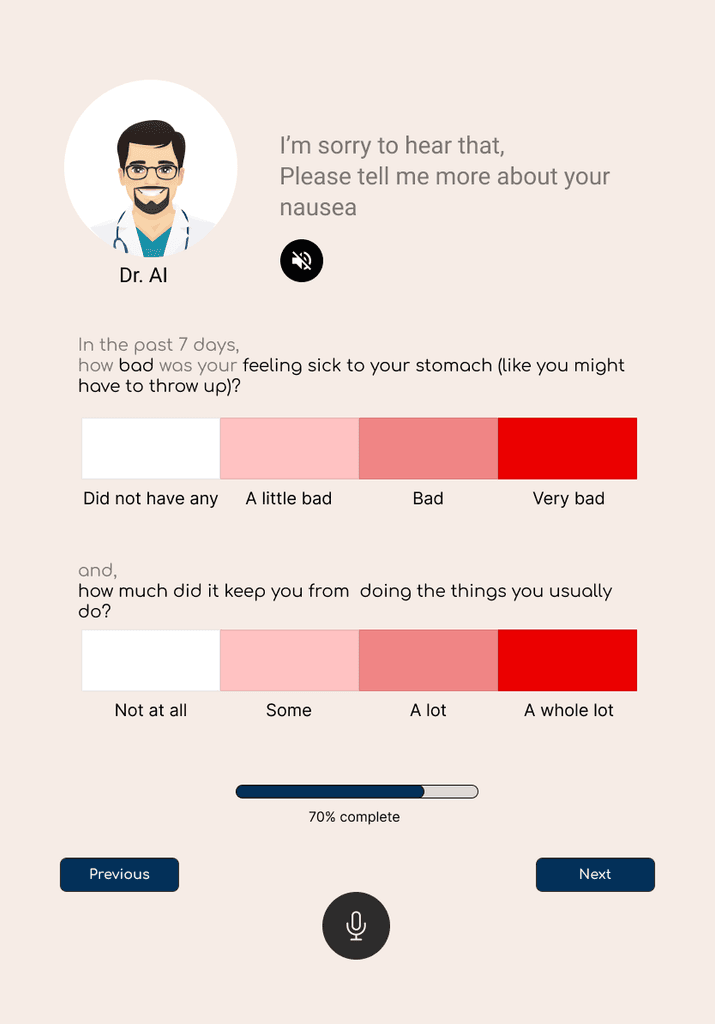 The UI uses calming colors and friendly fonts. Before the survey begins, patients are asked how they’re feeling; the system then prioritizes questions related to those symptoms first, capturing more accurate responses before fatigue sets in. The survey starts with one question at a time, gradually increasing the pace and including a progress bar to keep patients engaged. It also offers breaks and uses color-coded answer options to reduce cognitive load.