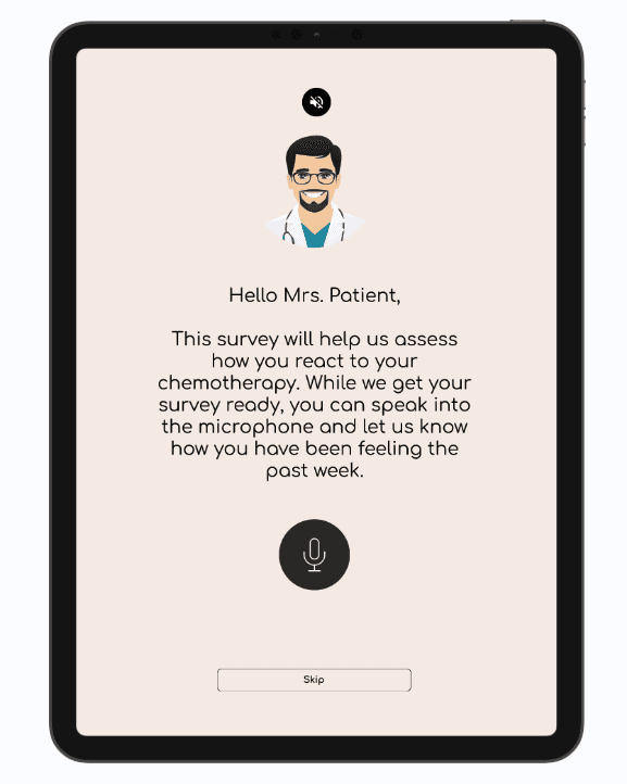 When a patient comes for their checkup and waits to see their physician, they are required to fill out the PRO-CTCAE, which the doctor then reads to assess how their symptoms have progressed. Patients are often extremely fatigued from their chemotherapy, and designing a comforting, empathetic experience was necessary.
